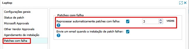 Você pode fazer esta configuração no menu "Configurações" > Gerenciamento de Patch > Política do Recurso. Então selecione a política desejada, clique em "Editar", vá até a guia "Patches com falha" e configure quantas vezes você quer que o N-sight RMM reprocesse o patch: